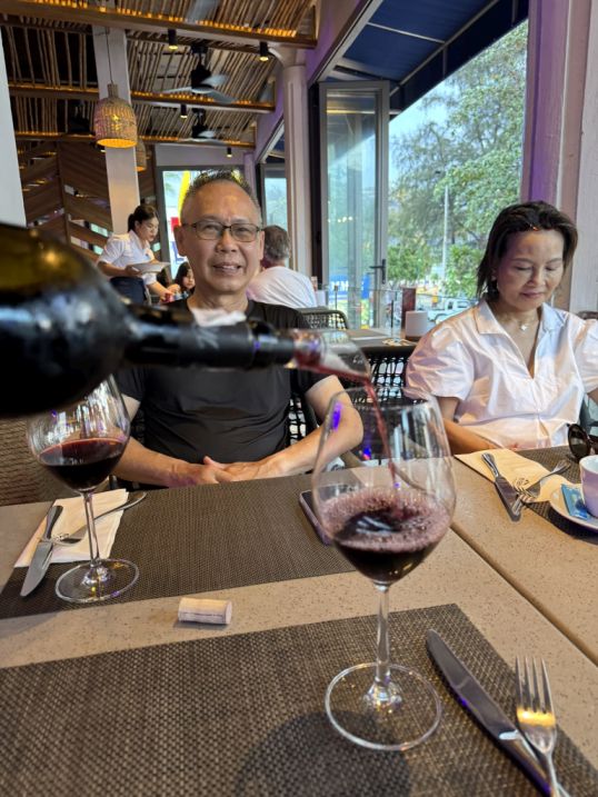 Minh ordering a red bottle of wine for the table.