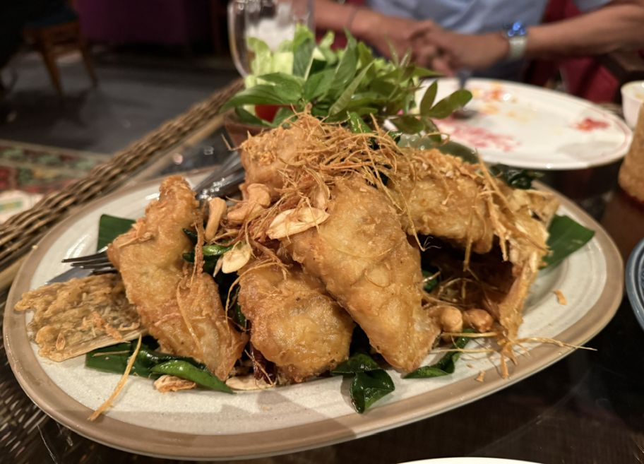 The meal continued with a standout dish: the deep-fried sea bass, crisp on the outside yet tender inside, enhanced by fish sauce and topped with crispy herbs, then brightened by a tangy, spicy salad dressing that cut through the richness