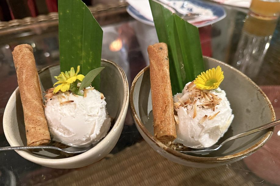Coconut ice cream served with delicate rolled crispy crepes, adding both texture and a light, refreshing finish.