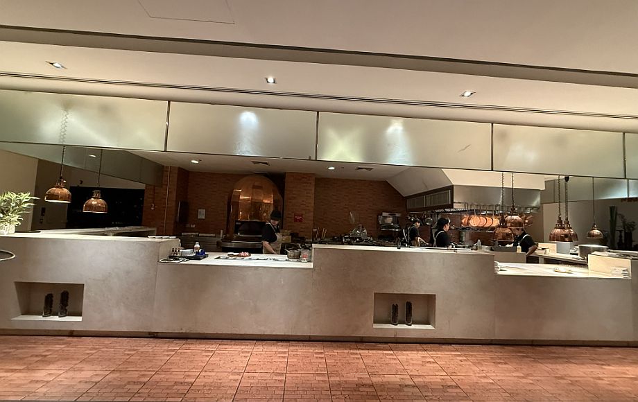 Inside, the long open kitchen counter becomes a centerpiece. It stretches elegantly along one side, allowing people to watch the chefs at work, plating dishes with precision, moving in a rhythm that feels almost choreographed.