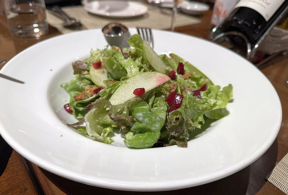 Insalata Favola came out first, mixed salad with marinated beetroot, green apple, caramelized walnuts, and pomegranate seeds, mixed in a yogurt and honey dressing., and to be fair it delivered exactly what we expected. It was fresh, well-balanced, and clean in flavor, crisp greens, bright dressing, and nicely composed. It felt like a reassuring start, a reminder of the level this restaurant is capable of.