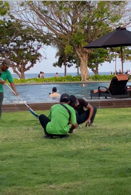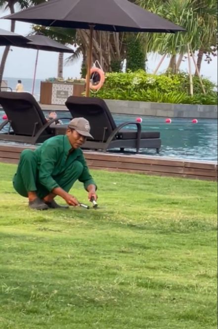 Sitting there with a drink in hand, the view unfolded in gentle layers. Closest to us, workers were quietly cutting the grass by hand, moving carefully and methodically, a scene that felt almost meditative and deeply rooted in tradition.