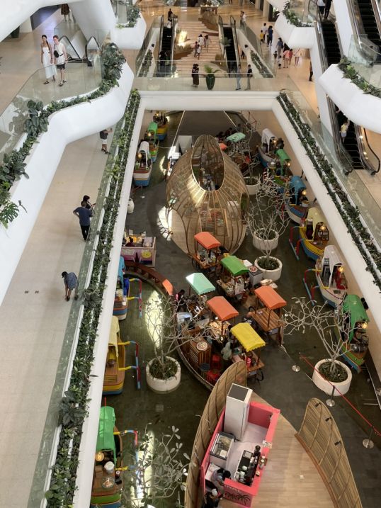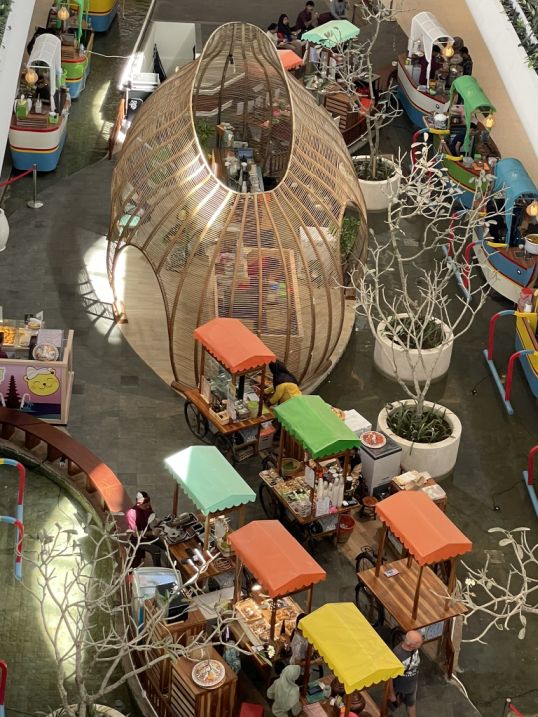 From the second floor, the view down opens up to one of the most lively and charming parts of Icon Bali. Below, you can see a collection of small vendors set up with carts, each topped with bright, colorful covers. From above, they almost look like a miniature market village, neatly arranged and full of energy. The pops of color stand out against the modern architecture, giving the space a playful, local feel that contrasts nicely with the clean lines of the complex.