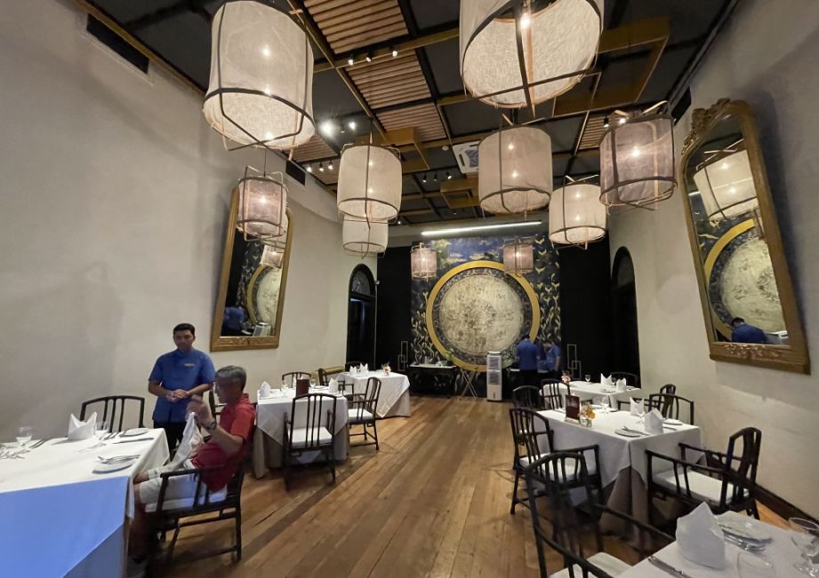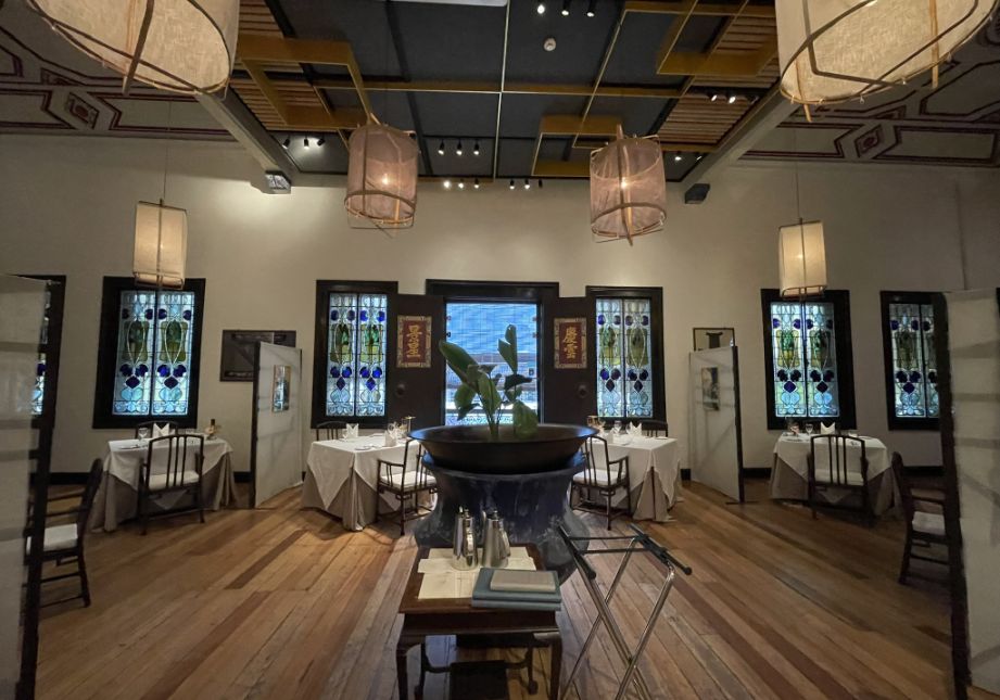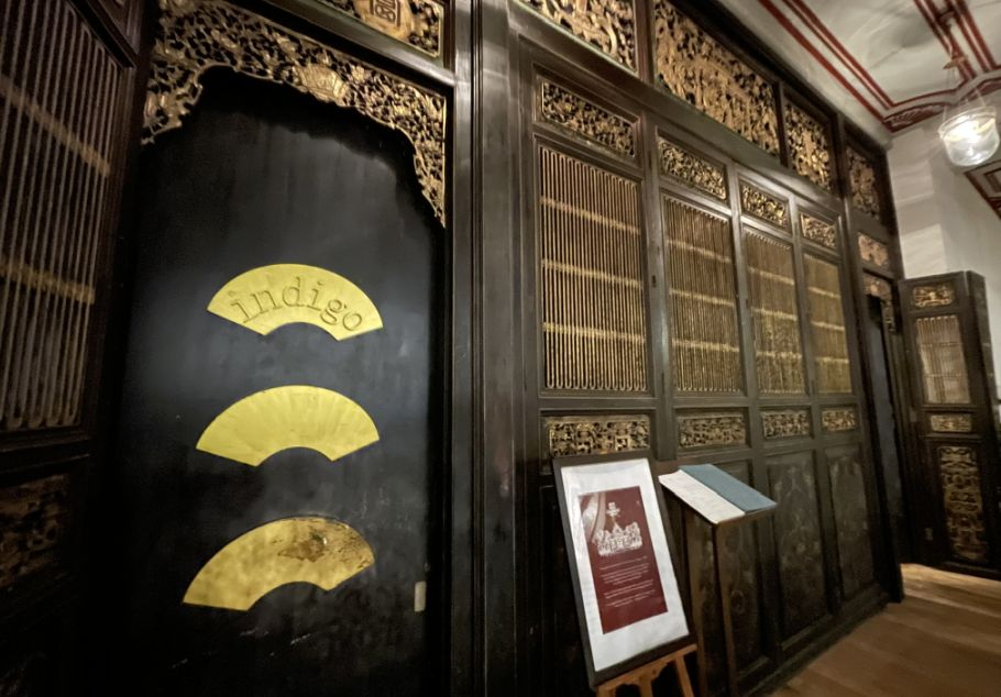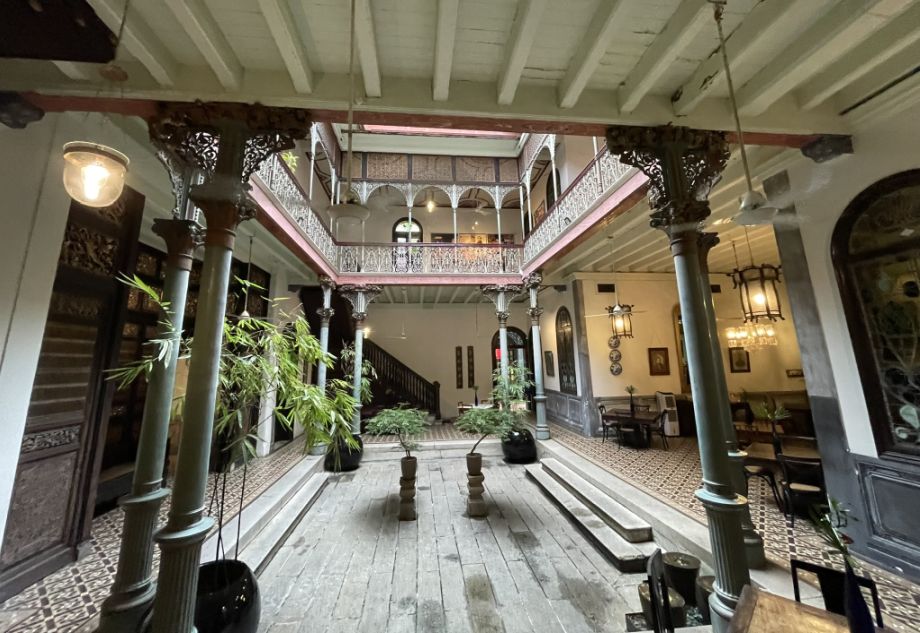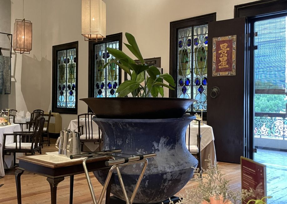 The room feels exceptionally elegant, almost ceremonial in its calm and balance. Before it became part of Indigo, this room was not a dining space. Historically, it functioned as a formal reception and ceremonial hall within the Cheong Fatt Tze Mansion. This was where the owner received important guests, business partners, and dignitaries, a space designed to impress and to reflect wealth, influence, and cosmopolitan taste. The grandeur of the room signaled status, while the stained glass, imported materials, and high ceiling showed an openness to Western design alongside Chinese traditions.