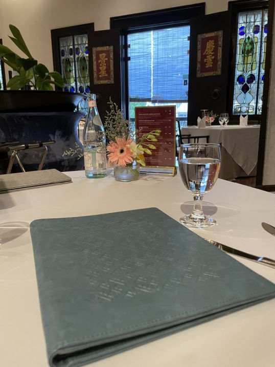 Stepping inside the restaurant, the space opens up dramatically with a large dining room with a tall ceiling, and the sense of height gives the room a calm, almost ceremonial grandeur. Light filters through stained glass windows filled with blue and green motifs, echoing the mansion’s signature color palette. The colors soften the room, casting a gentle glow that feels both intimate and elegant.
