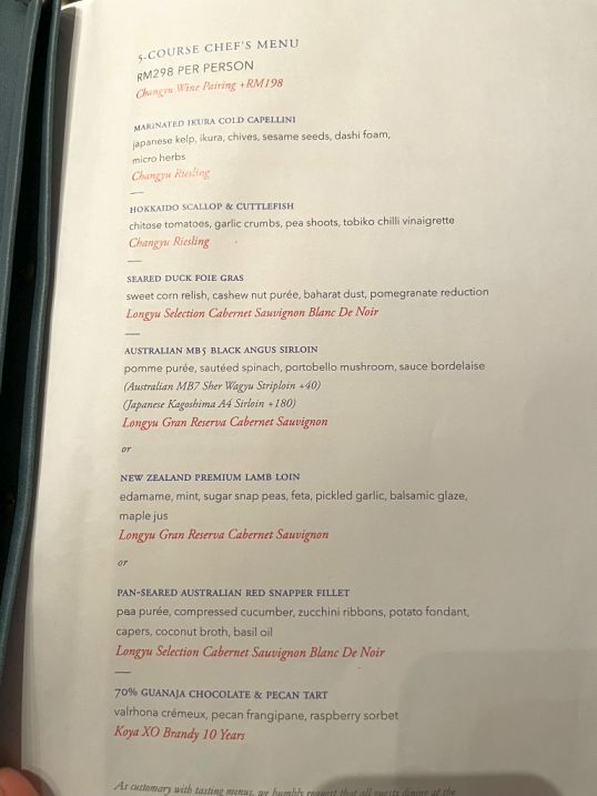 We selected the 5 course Chef's Menu at RM298 (about $75/per person) not including wine.