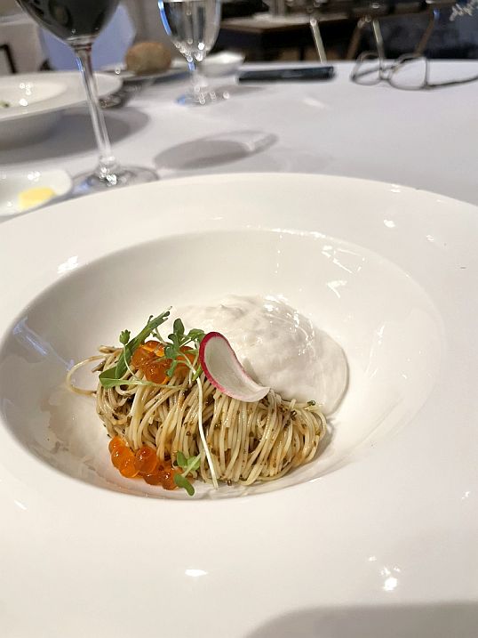 The meal begins lightly and delicately. Briny marinated ikura rests over strands of cold capellini, creating a silky, refreshing base. Notes of the sea come through the Japanese kelp and dashi foam, while chives, sesame seeds, and micro herbs add freshness and subtle texture. It’s clean, balanced, and quietly complex, an elegant opening that awakens the palate.
