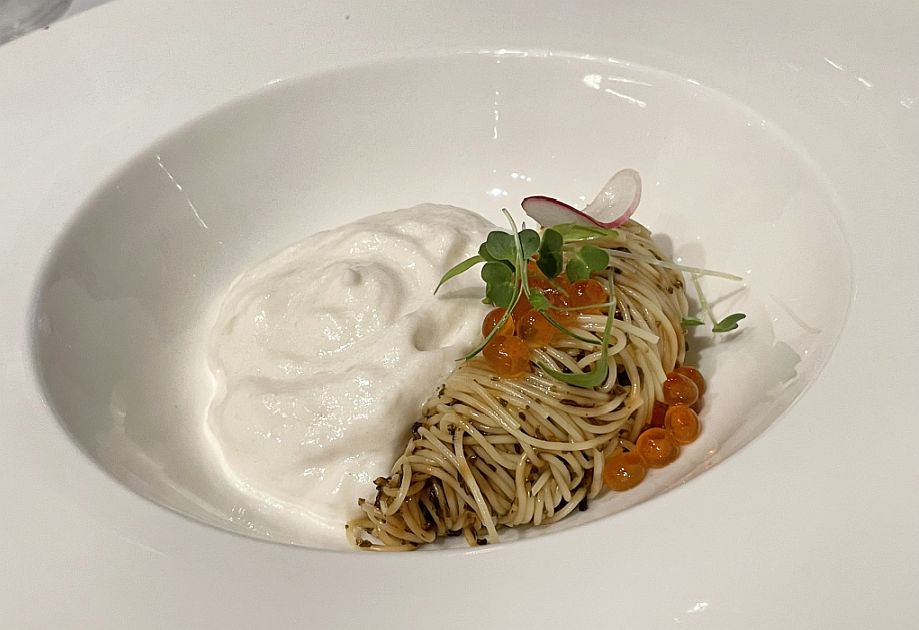 First course: Marinated Ikura with cold Capellini, Japanese Kelp, Ikura, chives, sesame seed, dashi foam, micro herbs