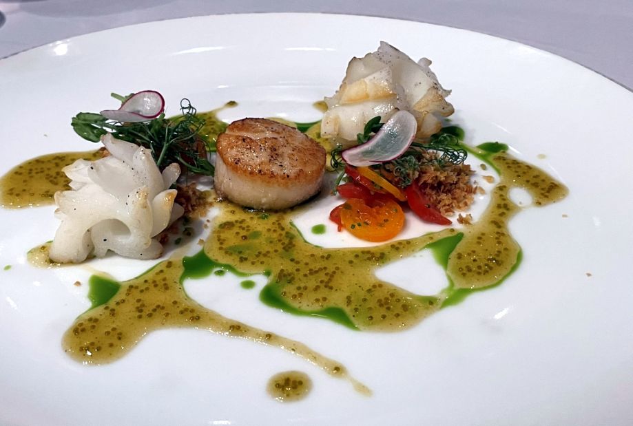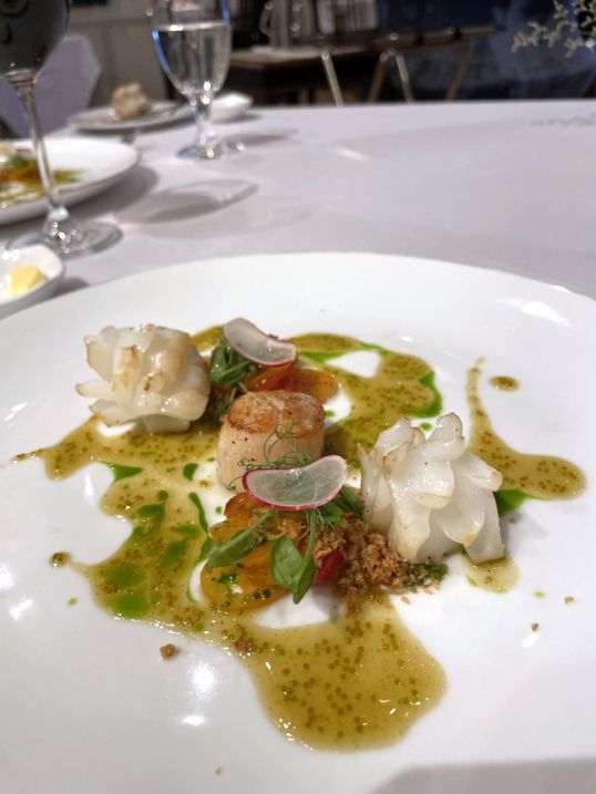 Course 2: Hokkaido scallop & Cuttlefish, chitose tomatoes, garlic crumbs, peat shoots, tobiko vinaigrette.