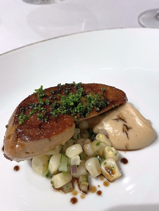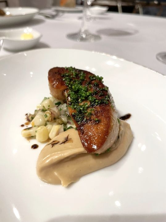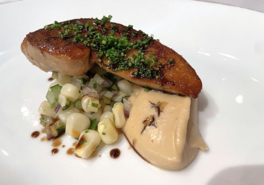 Course 3: Seared Duck Foie gras, sweet corn relish, cashew nut puree, bahara dust, pomegranate reduction.