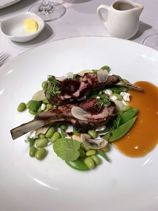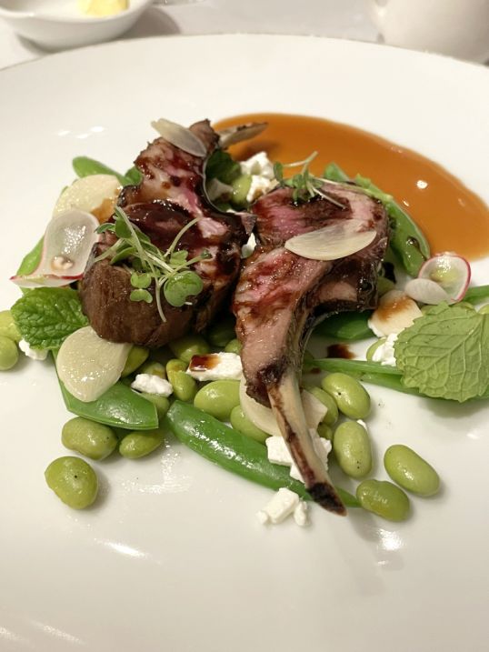 Course 4: New Zealand Premium Lamb Loin, edamame, mint, sugar peas, feta, pickled garlic, balsamic glaze, maple syrup.