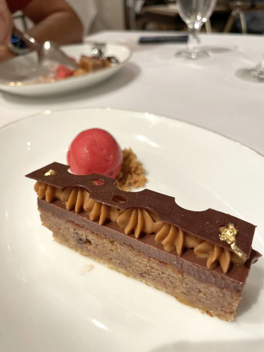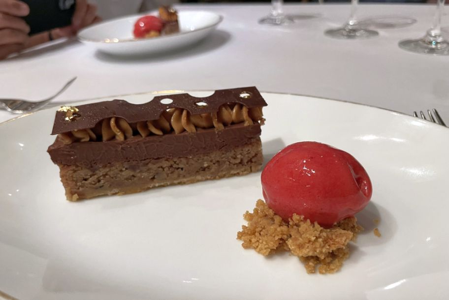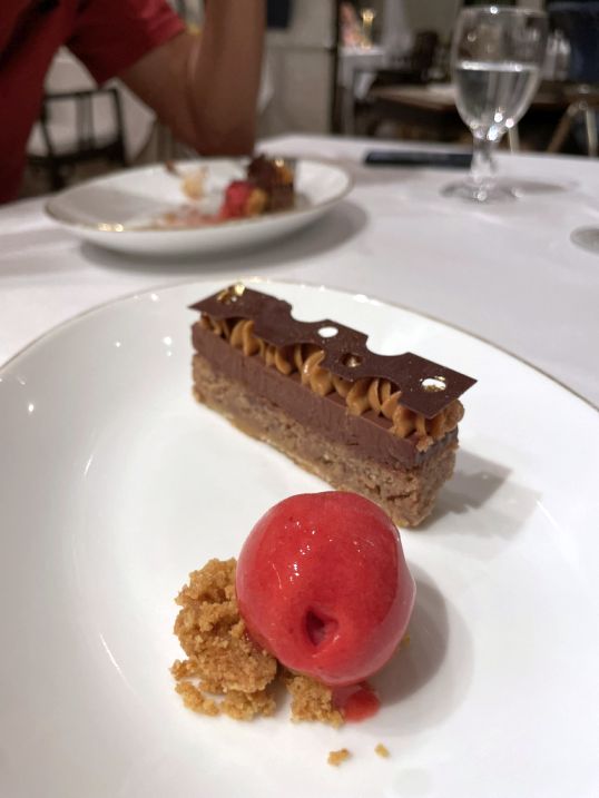 The finale is rich yet refined. The 70% Guanaja chocolate delivers deep cocoa intensity, softened by silky Valrhona crèmeux. Pecan frangipane adds nutty warmth, while the raspberry sorbet introduces a bright, refreshing finish. It’s indulgent without being heavy, a thoughtful and satisfying end to the meal.