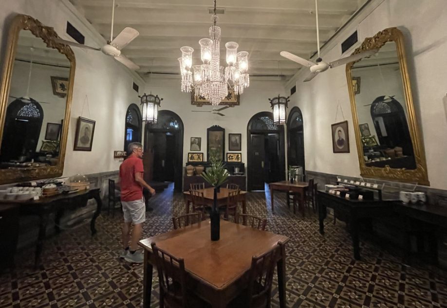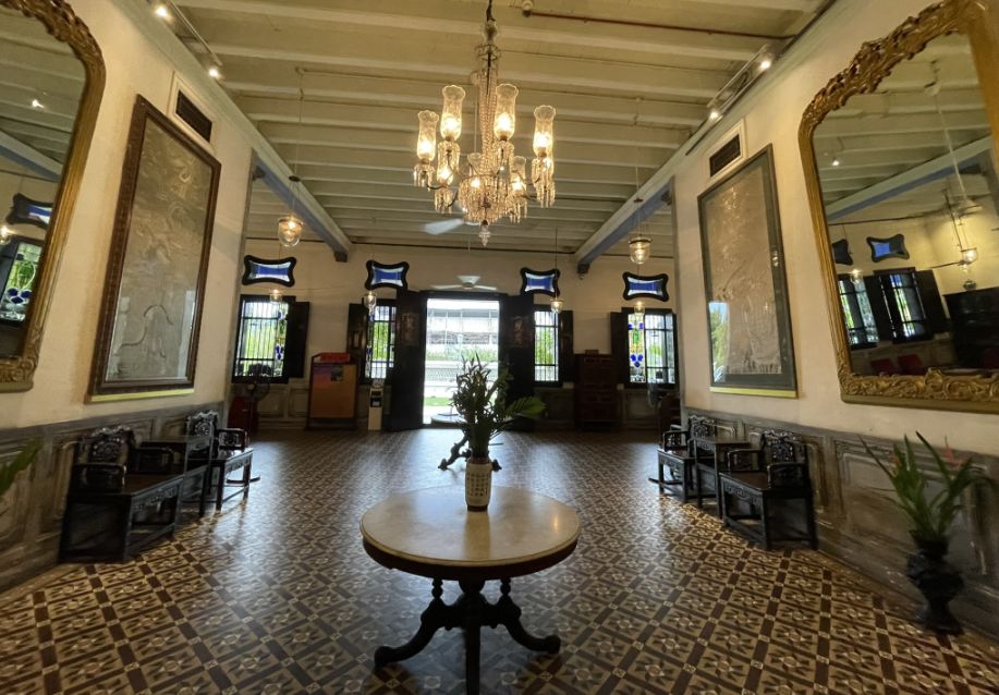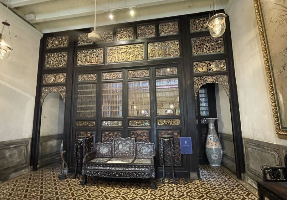 One wall stands out in particular, intricately decorated with gold Chinese reliefs, rich with symbols of prosperity and good fortune. The room perfectly captures the mansion’s character: Chinese tradition layered with colonial elegance.