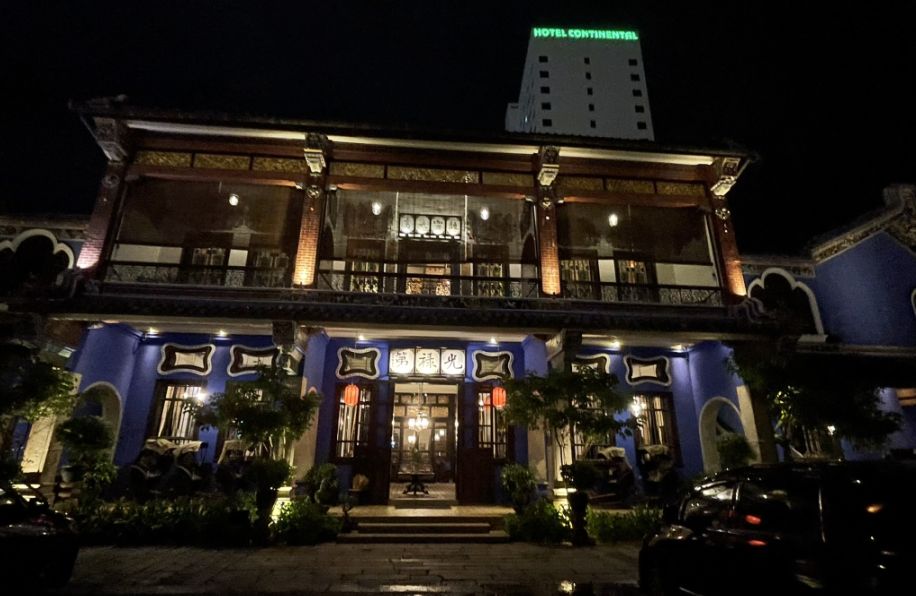 As we stepped out into the night, the Cheong Fatt Tze Mansion reveals a completely different kind of beauty. The blue façade, now softly illuminated, feels deeper and more dramatic, the color absorbing the light and giving the building a calm, almost cinematic presence. Every arch, window, and balcony stands out in quiet elegance, and the mansion feels less like a museum and more like a living memory glowing in the dark.