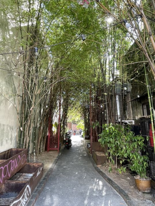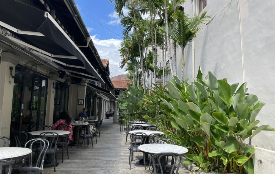 On Nuntri Street the atmosphere shifts again. The street is lined with two-story buildings, close together and human-scaled, forming a gentle corridor of heritage shop houses.