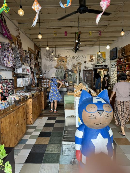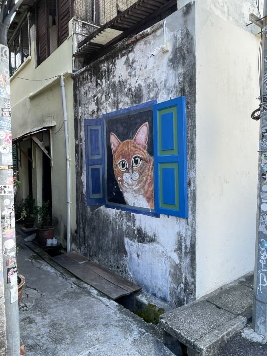 Along the way, we spot a piece of street art: a cat framed by blue and green window panels. It’s simple but charming, blending perfectly into the architecture around it. Like much of George Town’s street art, it feels playful and observant, small moments of creativity woven into old walls, waiting to be noticed.