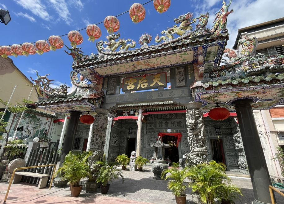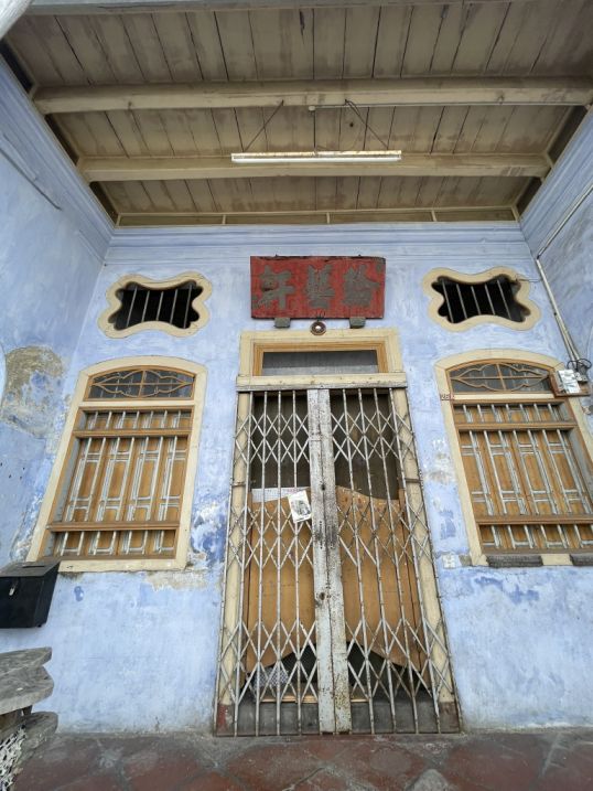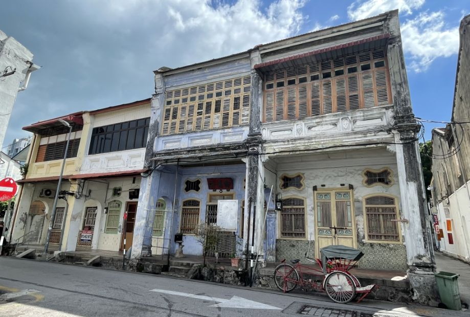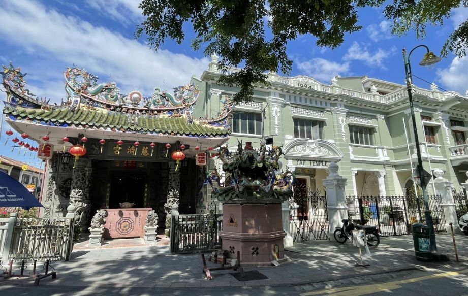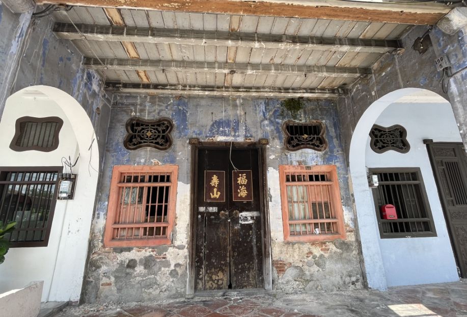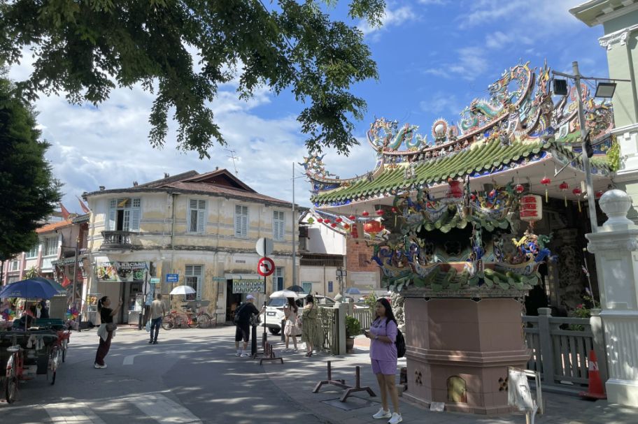 What makes this spot especially striking is its setting. The temple sits beside a row of elegant heritage buildings with white trim, classical pediments, and symmetrical façades. These architectural details reflect European neoclassical influence, common in George Town during the late 19th and early 20th centuries, when wealthy Chinese merchants adopted Western styles for their shop-houses and clan properties. The contrast works beautifully: the richly colored, traditional temple tucked next to refined, almost stately façades.
