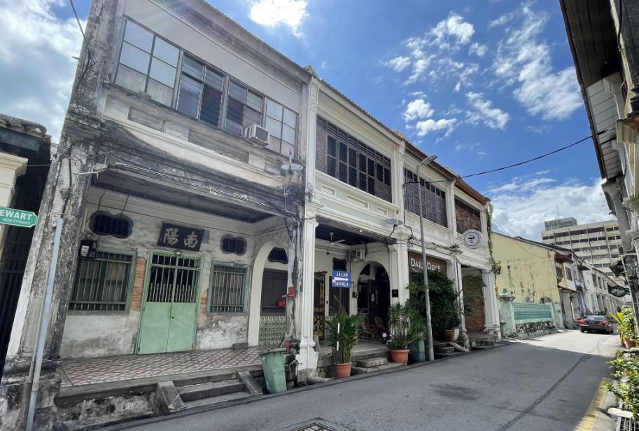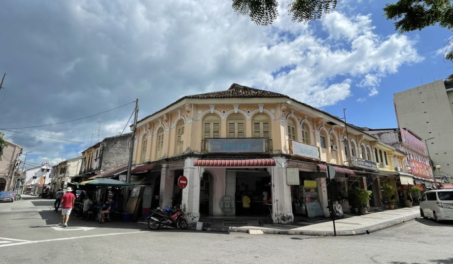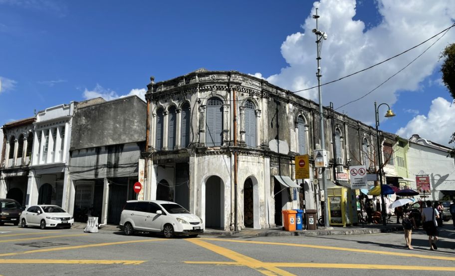 Standing at Pitt Street and Market Street, we are right in the middle of one of George Town’s most layered historic areas. The beautiful two-story building with the upper floor painted a soft peach and lined with many windows is a classic example of a Straits Eclectic shop house. These buildings were designed to be airy and bright, with tall windows to catch light and breeze in the tropical heat. The pastel color adds a gentle elegance, while the symmetry of the façade reflects the prosperity of merchants who once lived upstairs and ran businesses below.