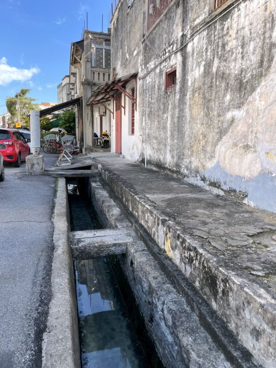 As we continue, I notice a canal running alongside the road, its water surprisingly clear as it flows steadily forward. It adds a gentle sense of movement to the walk and reminds me how George Town quietly weaves water management into its historic streetscape.