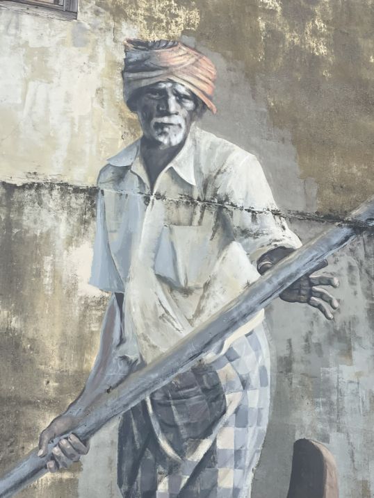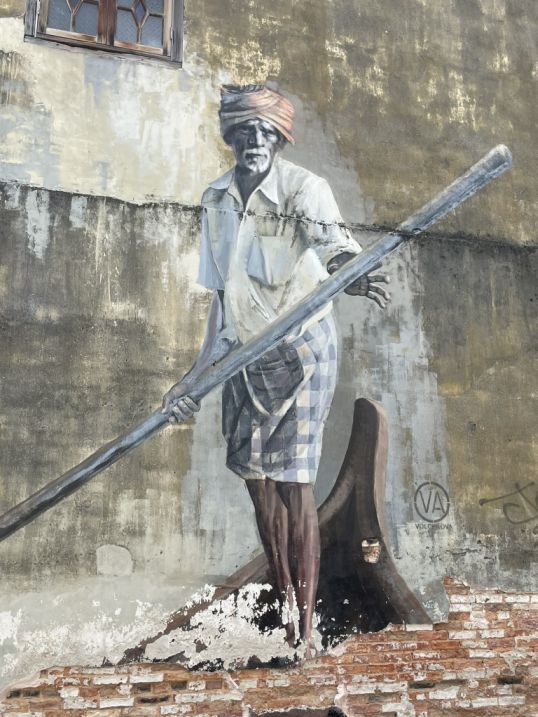 As we walked on, we passed by “The Indian Boatman,” one of George Town’s most quietly powerful murals. Painted on an old wall, it shows an Indian man standing beside a small boat, rendered in a realistic, almost weathered style.