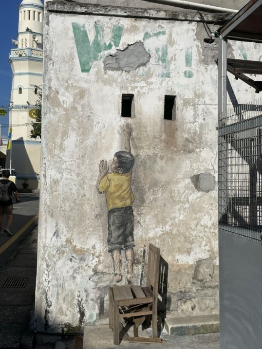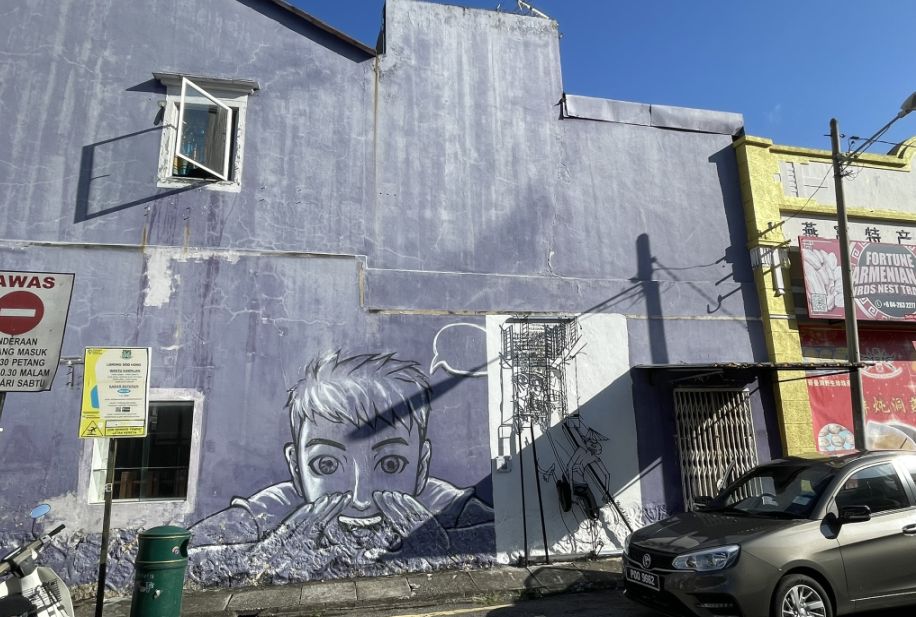 This street is especially famous for its murals, which helped put George Town on the global street-art map. The artworks here often feel playful and nostalgic, focusing on everyday life, childhood, and memory rather than grand historical scenes. Some murals interact directly with their surroundings, painted children reaching for real objects like bicycles, swings, or windows—blurring the line between art and the street itself.