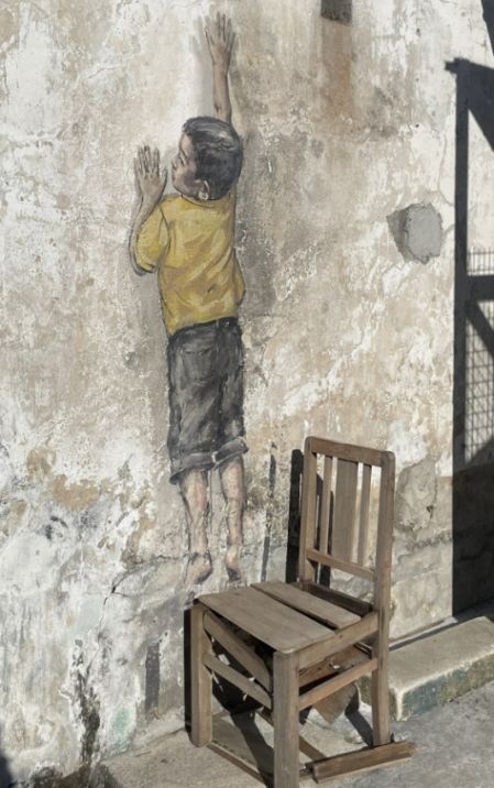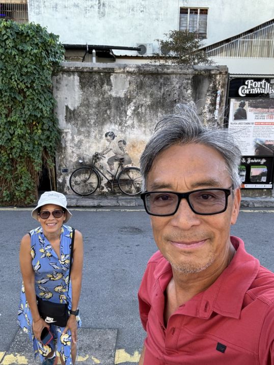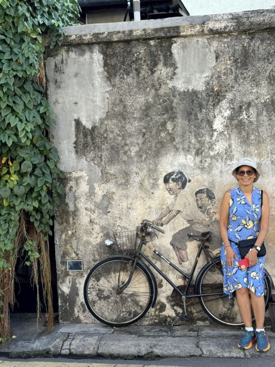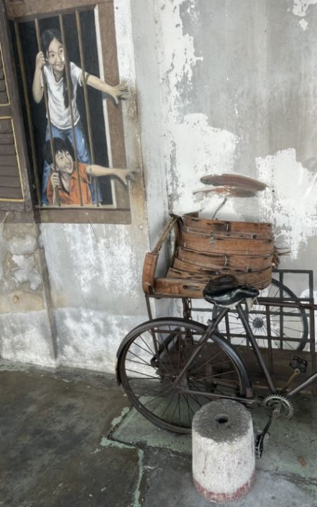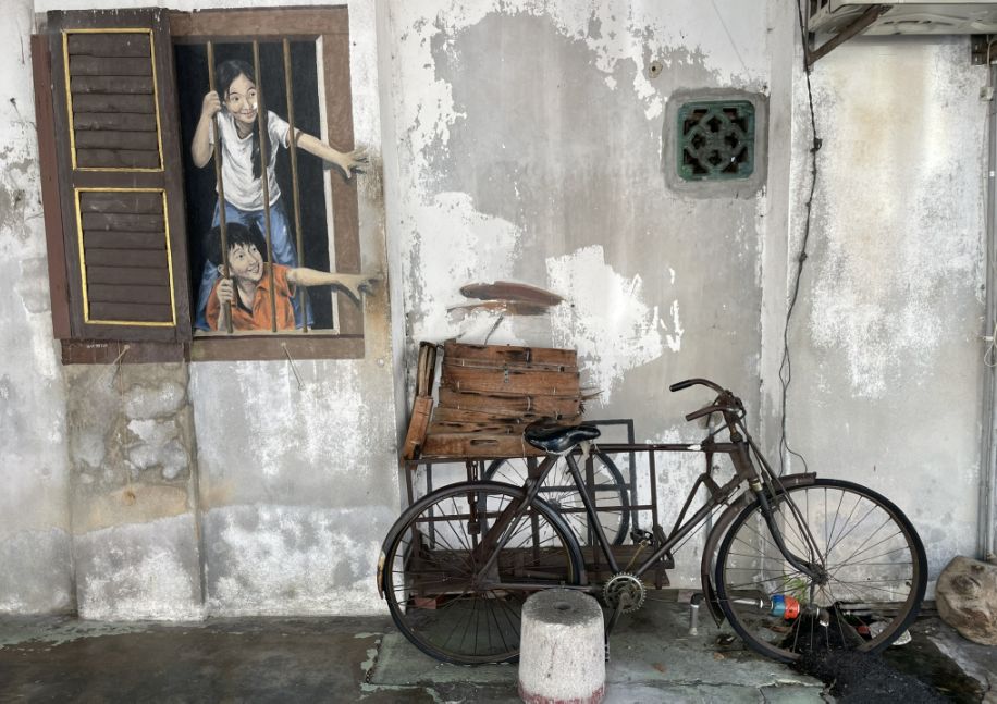 Then we reached one of George Town’s most famous murals: two young children riding a bicycle, where the bicycle is real and integrated into the artwork. The painted children grip the handlebars and seat, their faces full of joy and concentration.