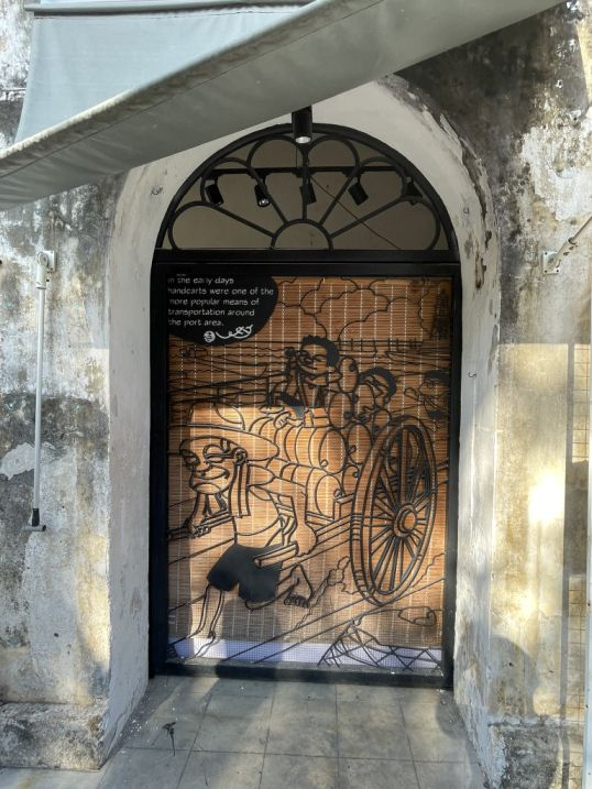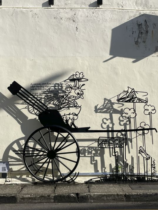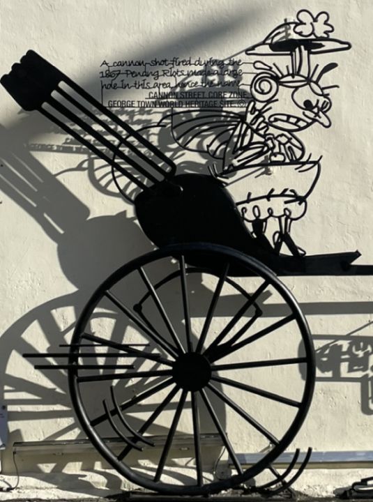 This metal sculpture on Cannon Street is one of George Town’s famous metal rod artworks, and it directly explains the origin of the street’s name. The scene shows a man on a black chariot, frozen in motion, with the words “a cannon shot fired…” incorporated into the piece. It’s a playful but informative way of telling a serious historical story. The sculpture refers to a violent clan feud in the 19th century, when rival Chinese secret societies and clans clashed in this area. During one of these conflicts, a cannon was reportedly fired here, giving Cannon Street its name.