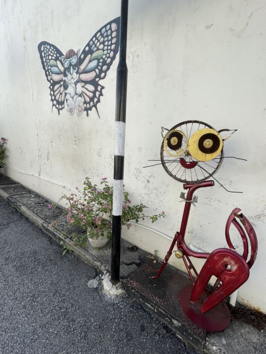 We are now in Cat Alley, a small, joyful surprise tucked away in George Town. Unlike the larger, more famous streets, this narrow lane is playful, intimate, and full of personality, clearly created with love by the local community. The alley is filled with cat-themed sculptures and murals, each one more imaginative than the last. One of the most striking pieces is the cat with butterfly wings, delicate and dreamlike, as if it’s about to lift off the wall. Nearby, the red kid’s bicycle transformed into a cat with its wheel reshaped into a cat’s head, and adds a sense of whimsy, blending real objects with art in a way that invites you to stop and look closely.