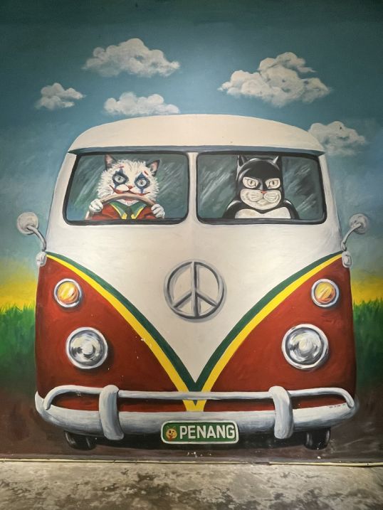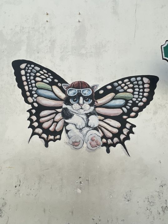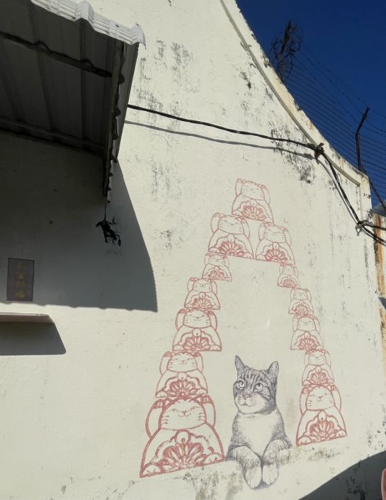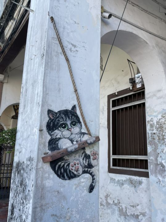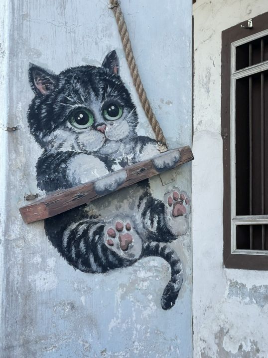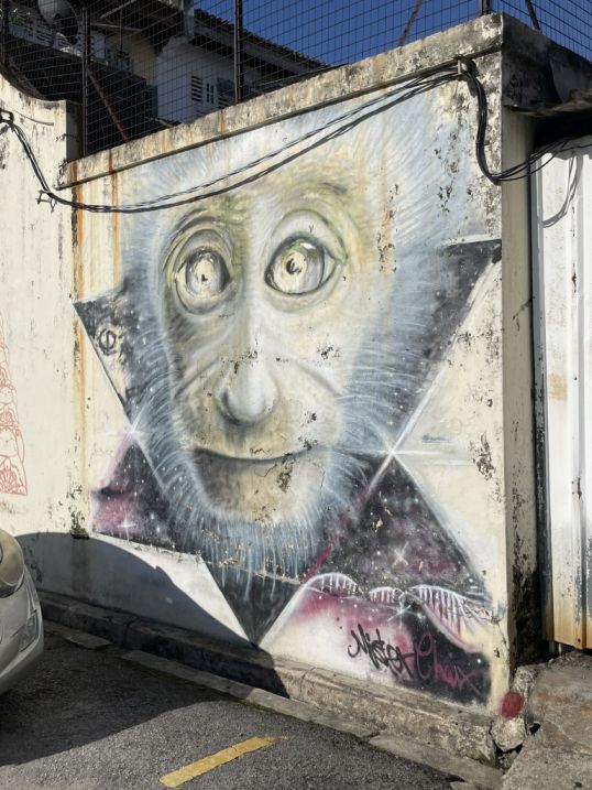 A monkey’s head mural comes into view, curious, expressive, and slightly mischievous. It feels like a quiet nod to the wildlife you’ve encountered elsewhere in Malaysia, but here it watches over the street from the safety of paint and brick. On the right, another mural with a cat looking up.