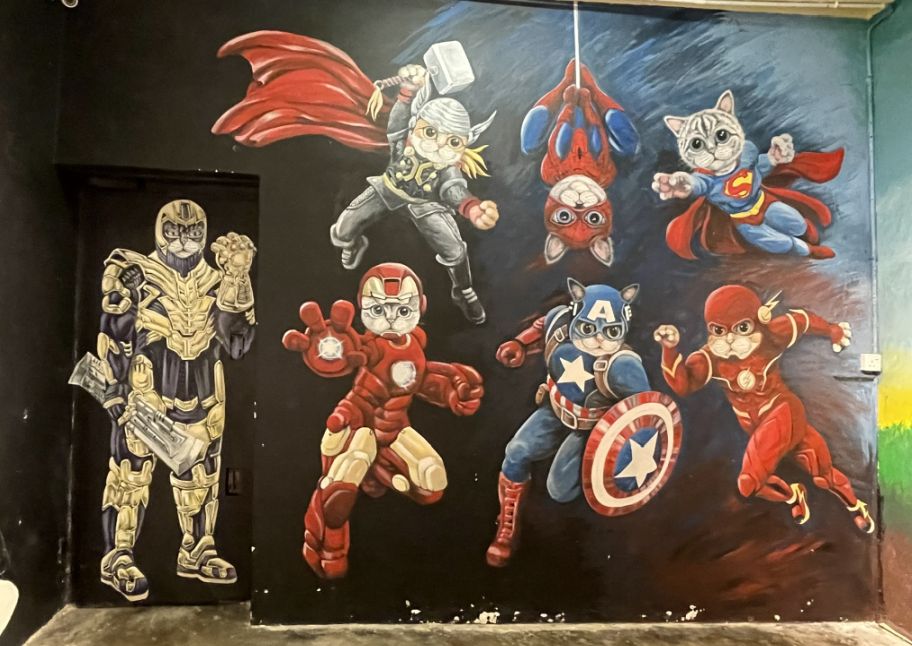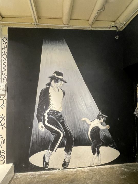 The walls inside the shop the walls burst with color and imagination, murals of Michael Jackson as a dancing cat, and scene of cats driving a VW van.