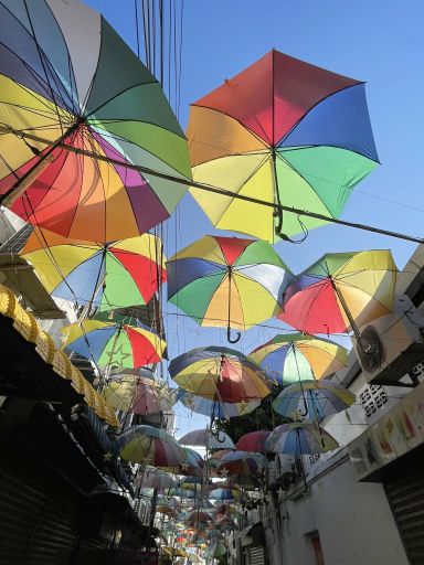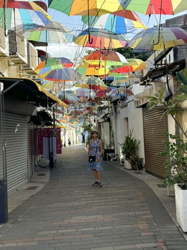 Walking into this narrow alley, the scene suddenly feels magical. Above us, rows of colorful umbrellas are suspended overhead, stretching from wall to wall like a floating canopy. Reds, blues, yellows, and greens overlap and catch the light, casting shade on the ground.