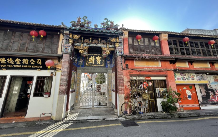 One of the most striking sights is the old Chinese gate crowned with two dragons facing each other. Dragons are powerful symbols in Chinese tradition, representing strength, protection, wisdom, and good luck. Gates like this often mark the entrance to an important space, such as a clan house, association hall, or significant community area. The paired dragons suggest balance and guardianship, as if watching over the street and everyone who passes beneath.