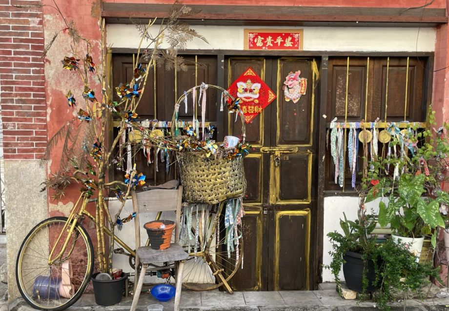 In front of shop, a traditional trishaw, one of George Town’s most recognizable sights. This trishaw is brightly decorated, colorful seats, tassels, flowers, lights, and sometimes even small speakers playing music. When they’re parked quietly like this, though, you can really appreciate their structure: the curved frames, thin wheels, and worn seats that hint at years of use.