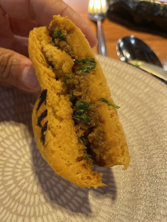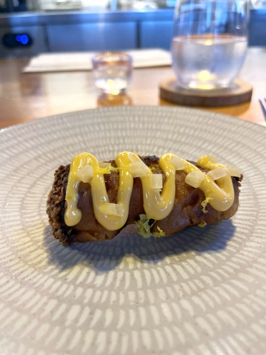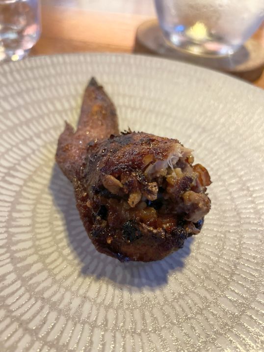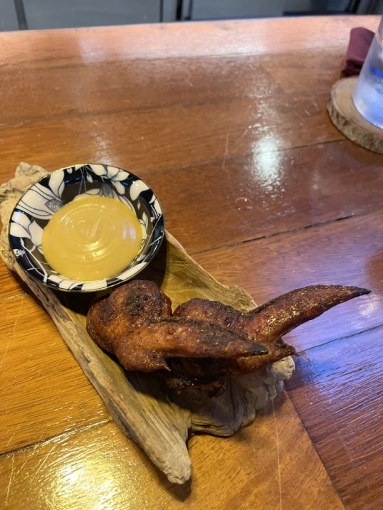 Next comes the stuffed chicken wing, filled with lotus rice, a comforting nod to traditional Penang and Chinese cooking. The skin is taut and savory, while the rice inside is fragrant and satisfying. The yellow dipping sauce, bright, tangy, and slightly spiced cuts through the richness and lifts the dish.