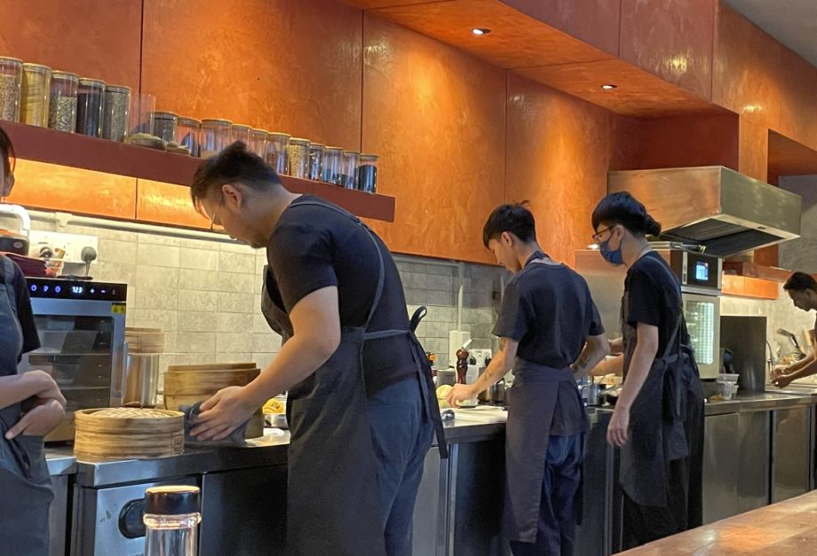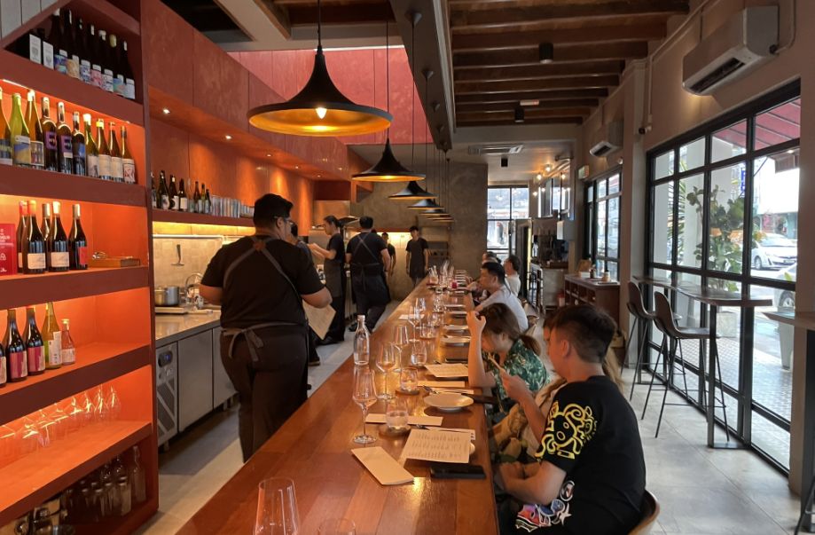 The kitchen feels almost like a performance, reinforcing the idea that food here is something to be experienced, not hidden away.