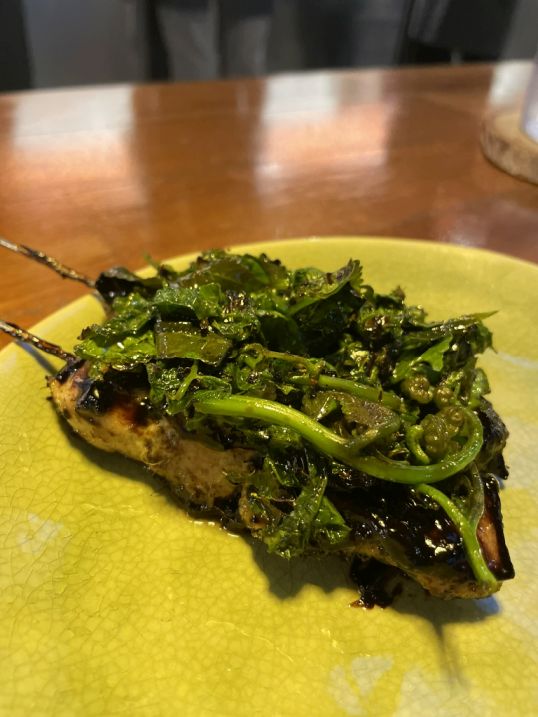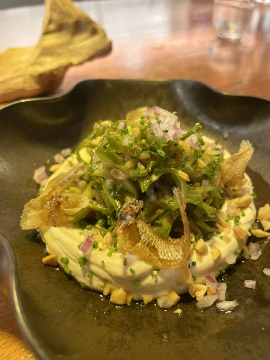 The pork collar skewer follows, juicy and well-charred, with that perfect balance of fat and tenderness, covered on top with buah keluak with pucuk paku. Earthy, slightly bitter, and intensely aromatic, the buah keluak brings depth and mystery, while the pucuk paku (fiddlehead fern) adds freshness and texture. It’s unmistakably Southeast Asian, bold and thoughtful.