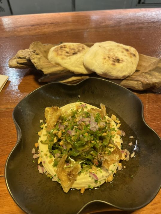 Another dish arrives with pureed elements, fried small fish, lots of green beans, and naan.