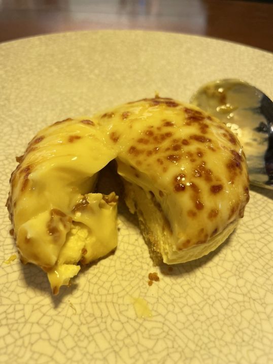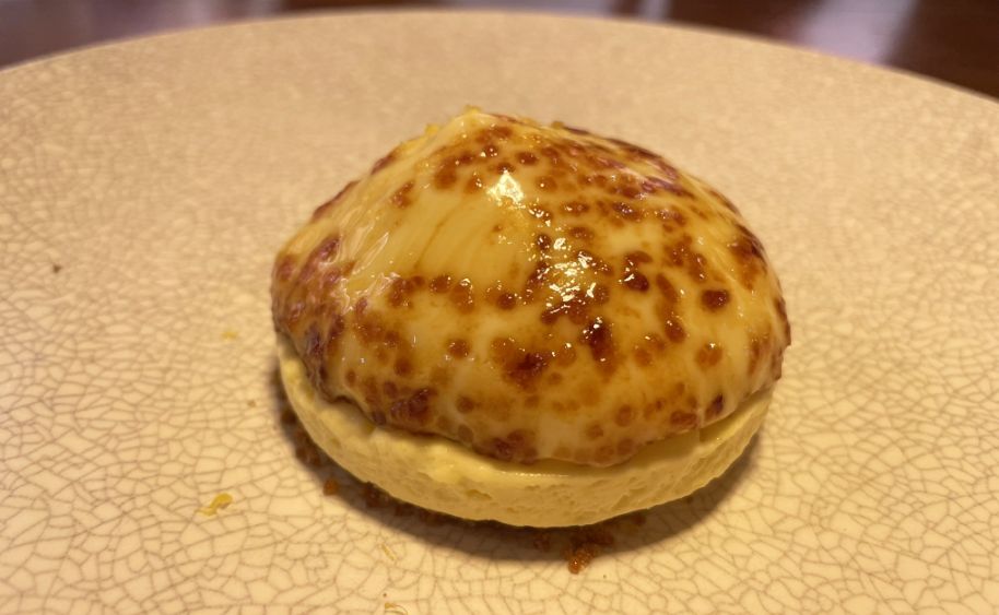 Dessert finishes on a lighter, nostalgic note: a sweet corn tart, topped with pillowy cream. The corn is naturally sweet and comforting, evoking local flavors, while the cream softens everything into a gentle, elegant ending, simple, familiar, and quietly indulgent.