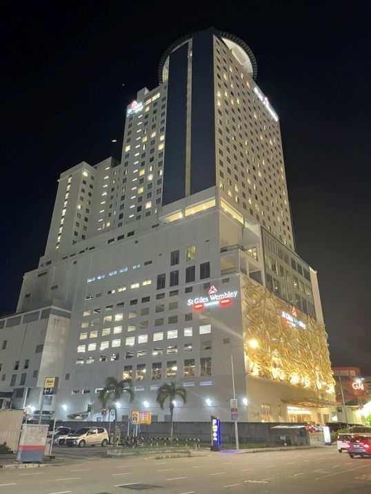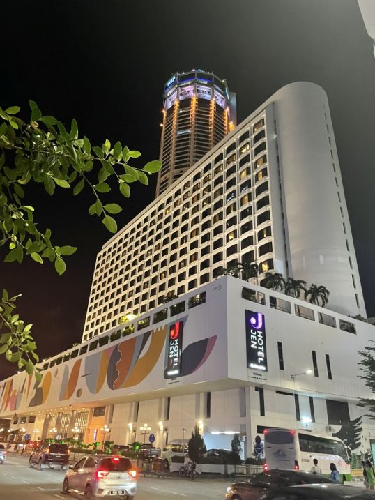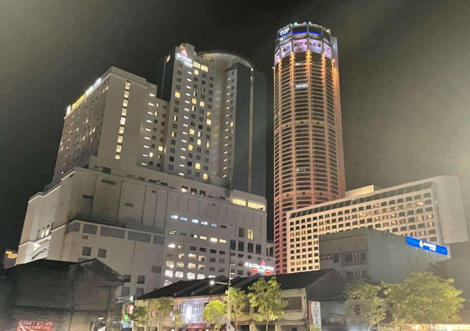 Walking back to our hotel at night, the city felt especially alive. The tall skyscrapers were fully illuminated, their lights reflecting off the streets and giving George Town a modern, energetic glow. Looking up, Komtar’s massive circular tower dominated the skyline, unmistakable and iconic against the night sky.