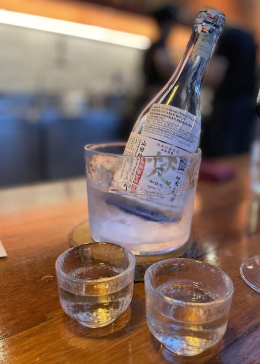 We begin with a bottle of sake and a red wine glass, setting a celebratory tone, light, social, and relaxed, very much in the spirit of Communal Table.