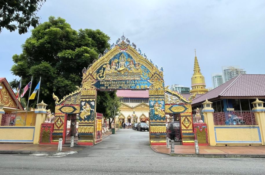 Approaching Wat Chayamangkalaram, the experience begins right at the main gate, which immediately feels ceremonial and protective. The gate is crowned with an elaborate sculpture above the entrance, rich with Thai symbolism. Flowing forms, layered details, and gilded elements draw the eye upward, signaling that you are about to enter a sacred space.