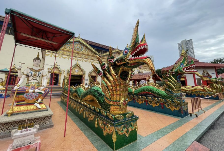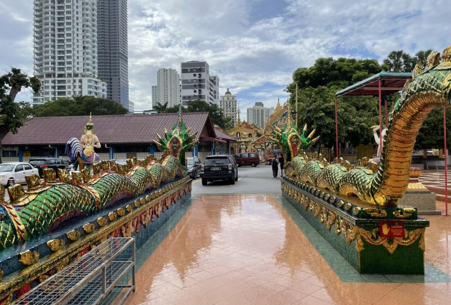 Visitors are greeted by mosaic-covered naga serpents and guardian dragons at the entrance.