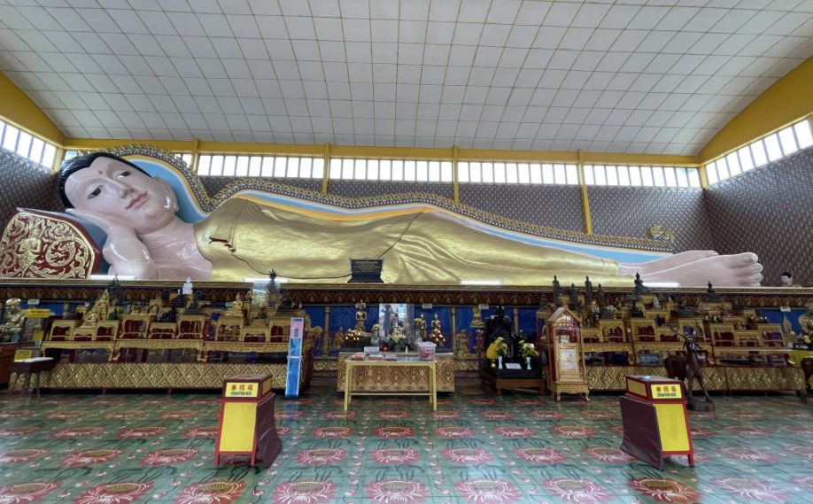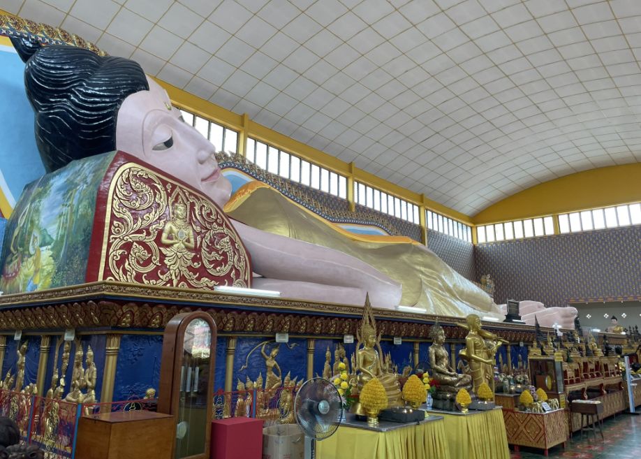 Inside, the first thing that truly overwhelms you is the huge reclining Buddha, measuring 108 ft. long gold-plated statue. Stretching nearly wall to wall, the statue depicts the Buddha lying on his side in serene repose, representing the moment of parinirvana, when the Buddha attained final enlightenment.
