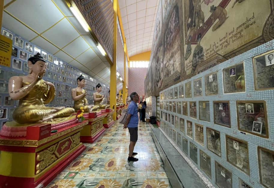 Along the walls behind the statues are columbarium niches. Inside those squares are the cremated remains (ashes) of the deceased. In many Thai and Chinese Buddhist traditions, it is considered a great honor and a blessing to have one's ashes kept inside a temple, especially near a sacred object like the massive Reclining Buddha. Each square is a private compartment purchased by a family.
