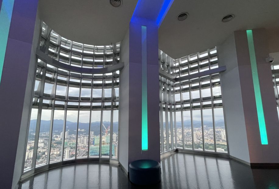 When the doors open on the 86th floor, we are suddenly surrounded by glass on all sides. We are on one of the tallest public viewing levels in the towers, roughly 1,130 feet above the city. From here, 360-degree views allow you to see Kuala Lumpur’s skyline, parks, horizon, and distant ridges through large uninterrupted windows.