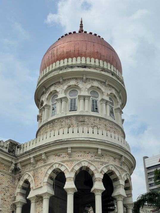 The arcaded corridors, with their repeating arches, run along the building and create shaded walkways. These arcades are both functional and decorative. In Kuala Lumpur’s tropical climate, they provide relief from sun and rain, while also emphasizing symmetry and rhythm in the design.