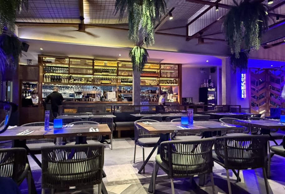 As night settled in, Summer Seaside Restaurant Phuket transformed into something even more atmospheric, the bar softly glowing, and the tables lit with cool blue lamps that gave the whole space a relaxed, almost seaside-lounge vibe.