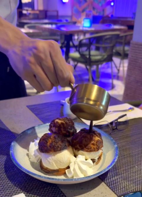 Dessert was a highlight: a plate of profiteroles filled with ice cream and whipped cream, and then our waiter pours the hot chocolate sauce over the top.