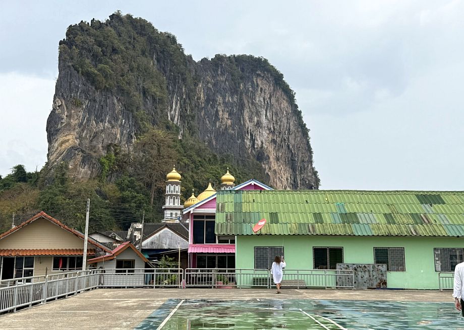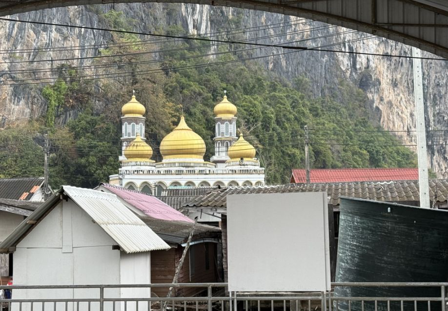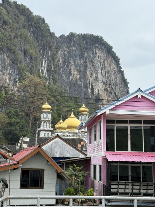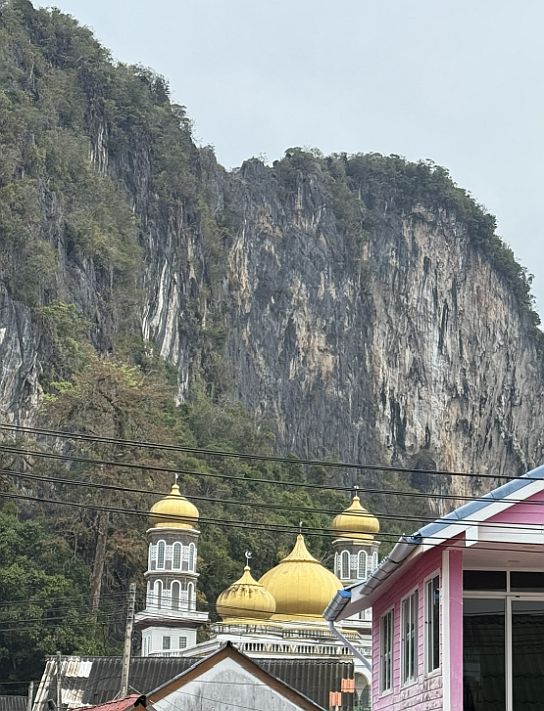 As we turned around on that wide platform, the scene shifts into something almost cinematic. Just above the clustered rooftops, we caught sight of the mosque with its golden roof gleaming softly in the light. It’s only a partial view, tucked behind the houses, but it feels central, quietly anchoring the village. Rising directly behind it is a towering karst mountain, sheer and imposing, its height almost overwhelming at this distance. The contrast is striking: a place of worship nestled beneath something ancient and monumental.