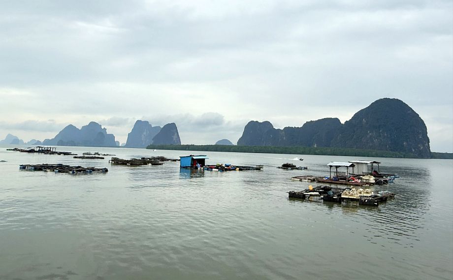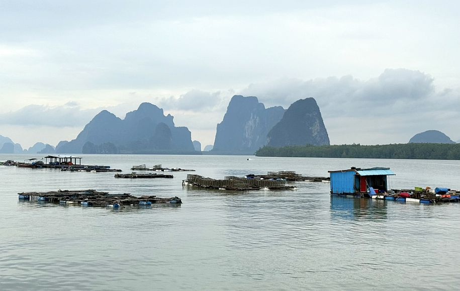 Standing on that wide platform near the floating football field in Ko Panyi, the view opens up in a completely different way compared to the enclosed limestone bays you saw earlier. Here, the horizon stretches wider, and the sea is dotted with those familiar karst mountains, rising abruptly from the water like scattered stone pillars, each one slightly different in shape and distance, creating that layered, almost dreamlike backdrop.